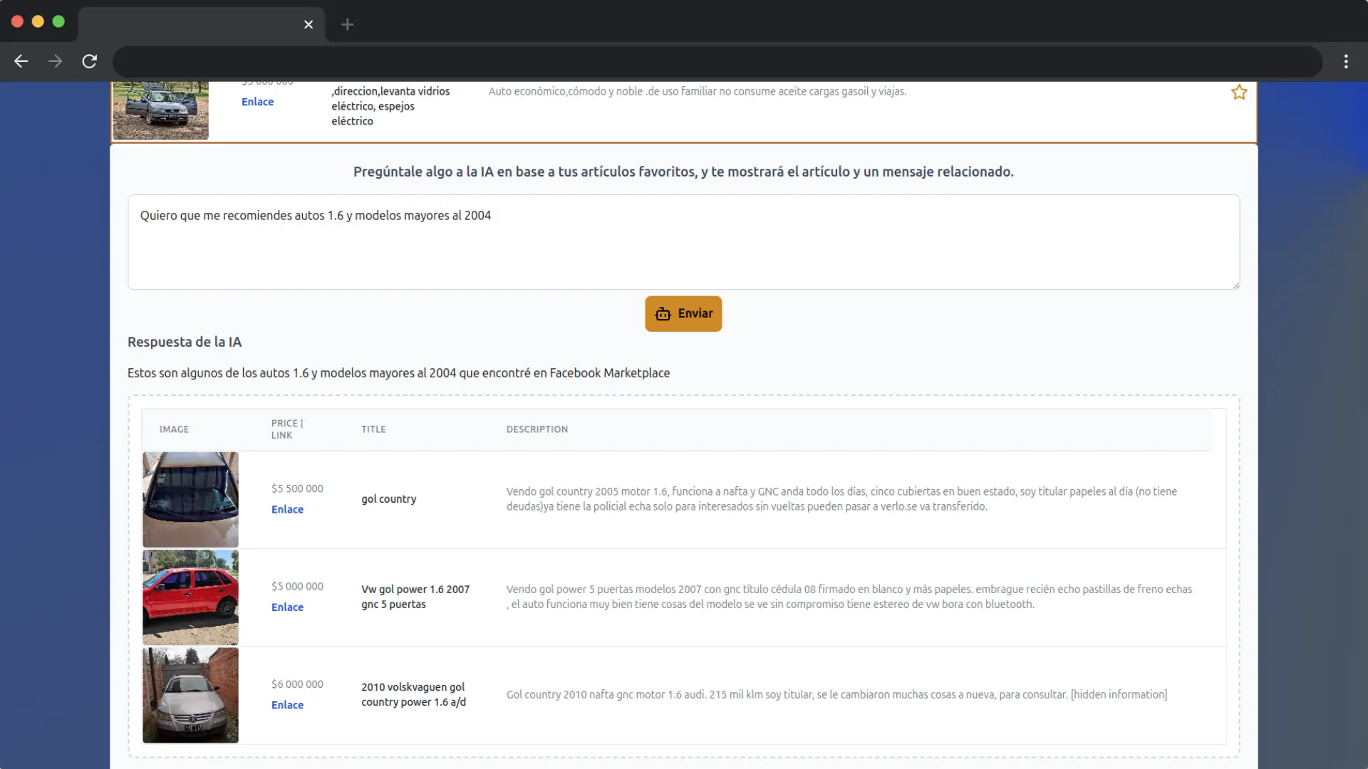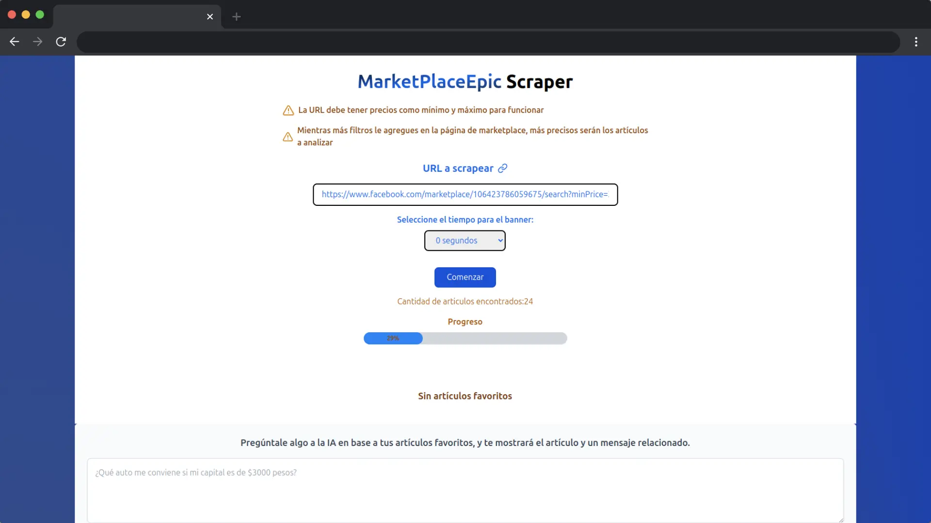 Desarrollé una aplicación que permite ingresar un enlace de búsqueda de artículos de un marketplace y extrae información en tiempo real usando un servidor en Express con Puppeteer. La información recopilada se muestra en una interfaz construida con React y Vite, donde los usuarios pueden agregar artículos a favoritos y hacer consultas a una IA. Utilicé Server-Sent Events (SSE) para manejar la transmisión continua de datos.